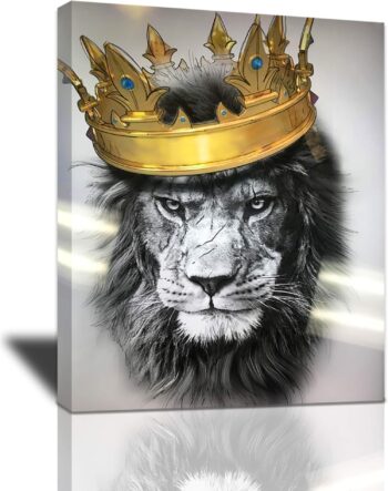 لوحة فنية قماشية بتصميم للأسد مع التاج، فن تجريدي للحيوان الملكي بتفاصيل ذهبية، طباعة حديثة للمنزل، ديكور حائط خشبي مؤطر، بوستر لغرفة النوم أو الحمام- 30.48 سم × 40.64 سم- أسود وأبيض