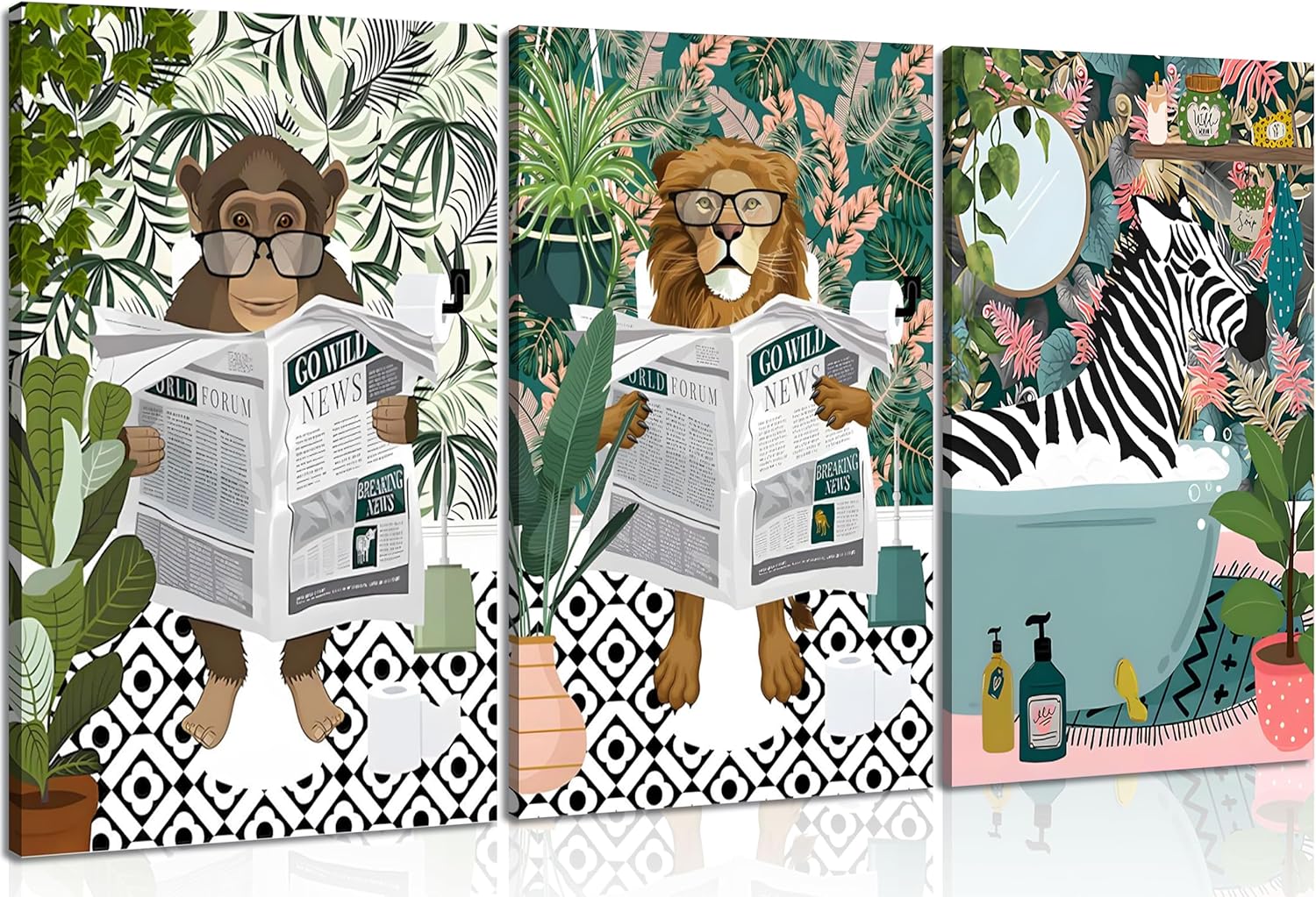 3 قطع من اللوحات الفنية الجدارية على شكل حيوانات الغابة والحمار الوحشي في حوض الاستحمام صور اسد قرد المرحاض لوحات قراءة الصحف ملصقات غابة مضحكة مطبوعة لتزيين جدار الحمام مؤطرة