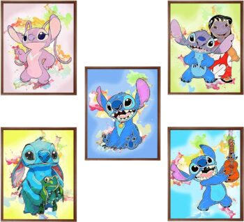 هدايا ليلو وستيتش- مجموعة من 5 لوحات جدارية بدون اطار قياس 8 × 10 بوصة بتصميم فتاة وعائلة ملصقات لغرفة الاولاد وغرفة البنات ديكور نوم الاطفال متعدد الألوان
