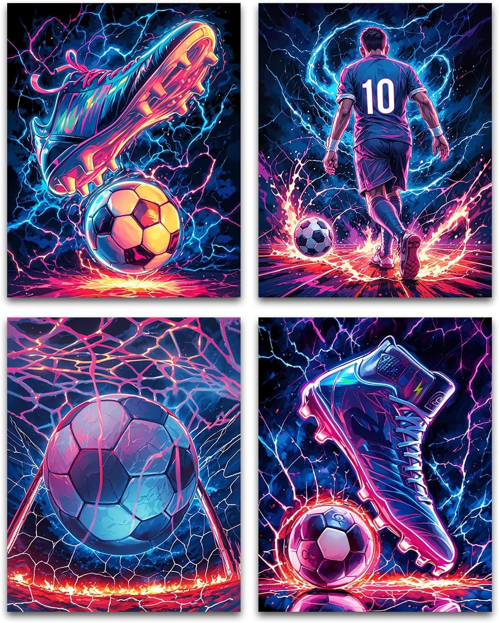 مطبوعات قماشية رائعة لكرة القدم من زهاكسفا بوسترات كرة قدم تجريدية جدارية لغرفة النوم للاولاد النيون مجموعة 4 لرياضة للرجال بدون اطار 8×10 انش .